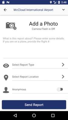 * The Report a Problem button allows users to send incident reports directly. To ensure discretion, the camera flash is automatically disabled when photos are taken through the app. App users may also send reports anonymously if they chose.
