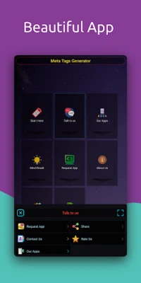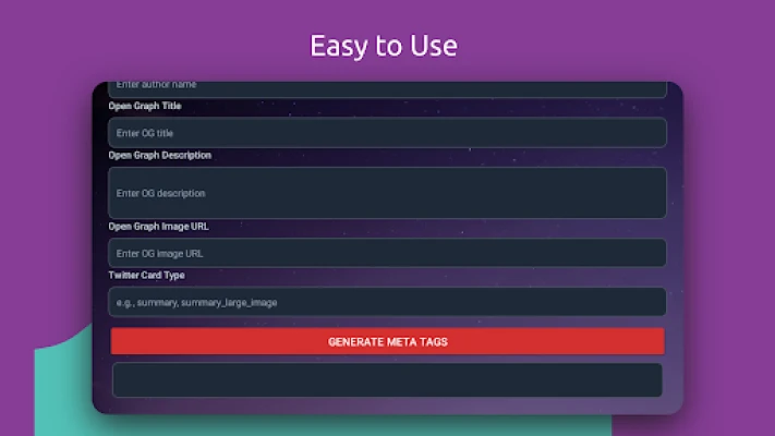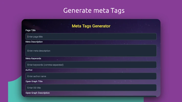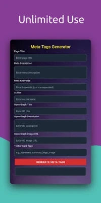 FREE app. This is a SEO Meta Tags Generator. With this app you can Create optimized meta tags for your web pages. Meta Tags are HTML tags that describe the content of your website to search engines and social media platforms. They help search engines understand what your website is about and rank it accordingly. Meta tags are typically placed in the head section of your HTML document.